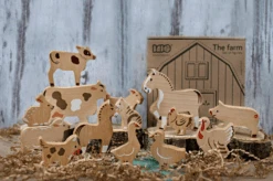 This is classic wooden set contains 14 animals: Horse, foal, goat, pig, dog, calf, cow, turkey, goose, duck, hen, sheep, rabbit, cat. Let have little farmer have a fun, nicely