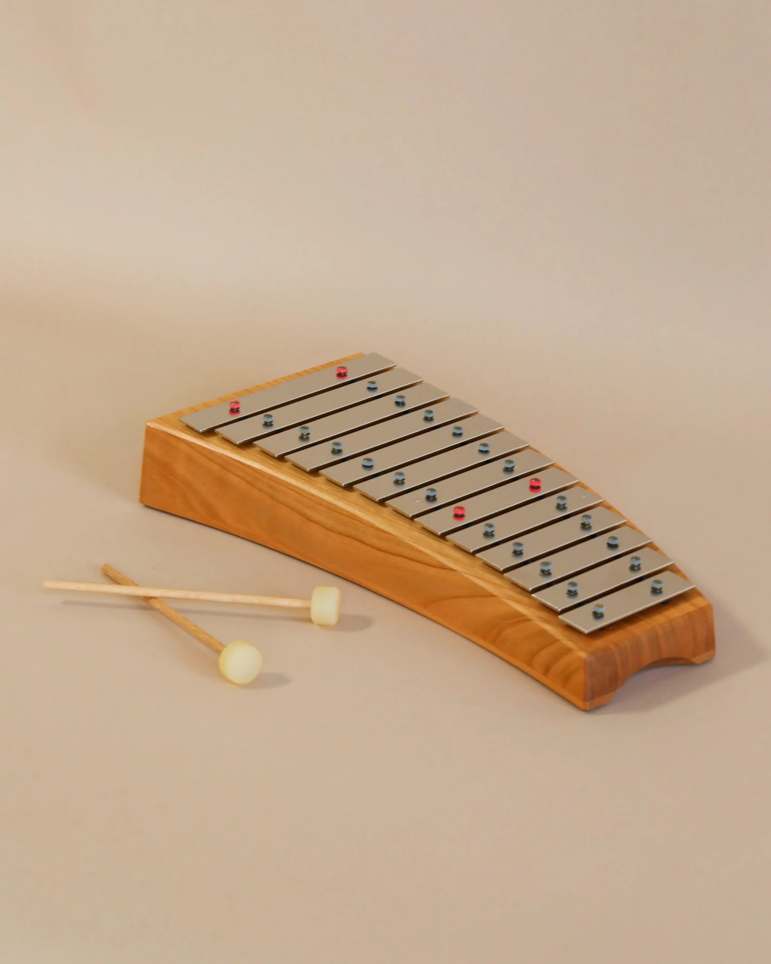 These three-tone glockenspiels use the same tones as are on our Pentatonic Glockenspiel. A simple instrument that fits nicely when playing in groups or for a toddler to begin with. Maple wood, brass plates.