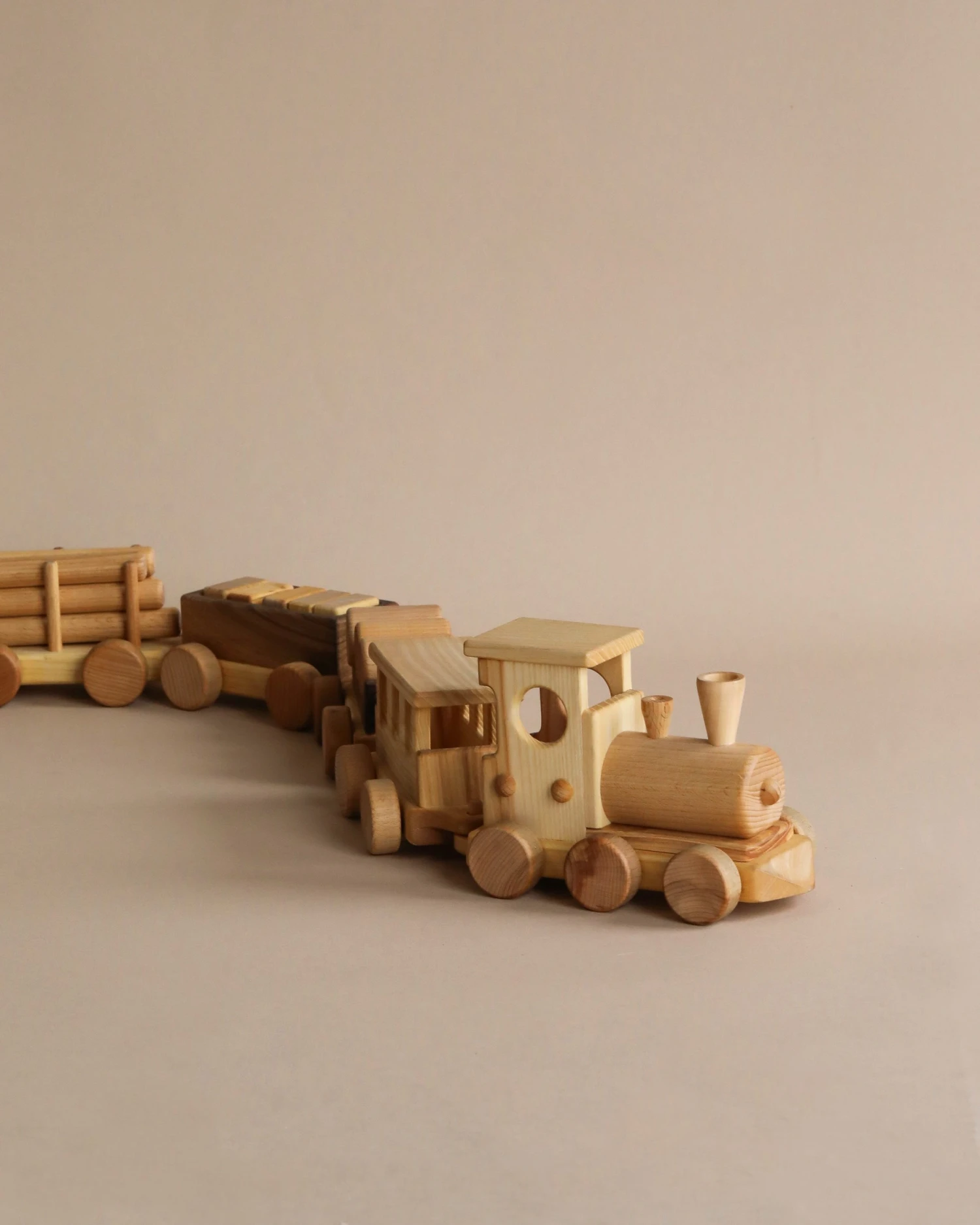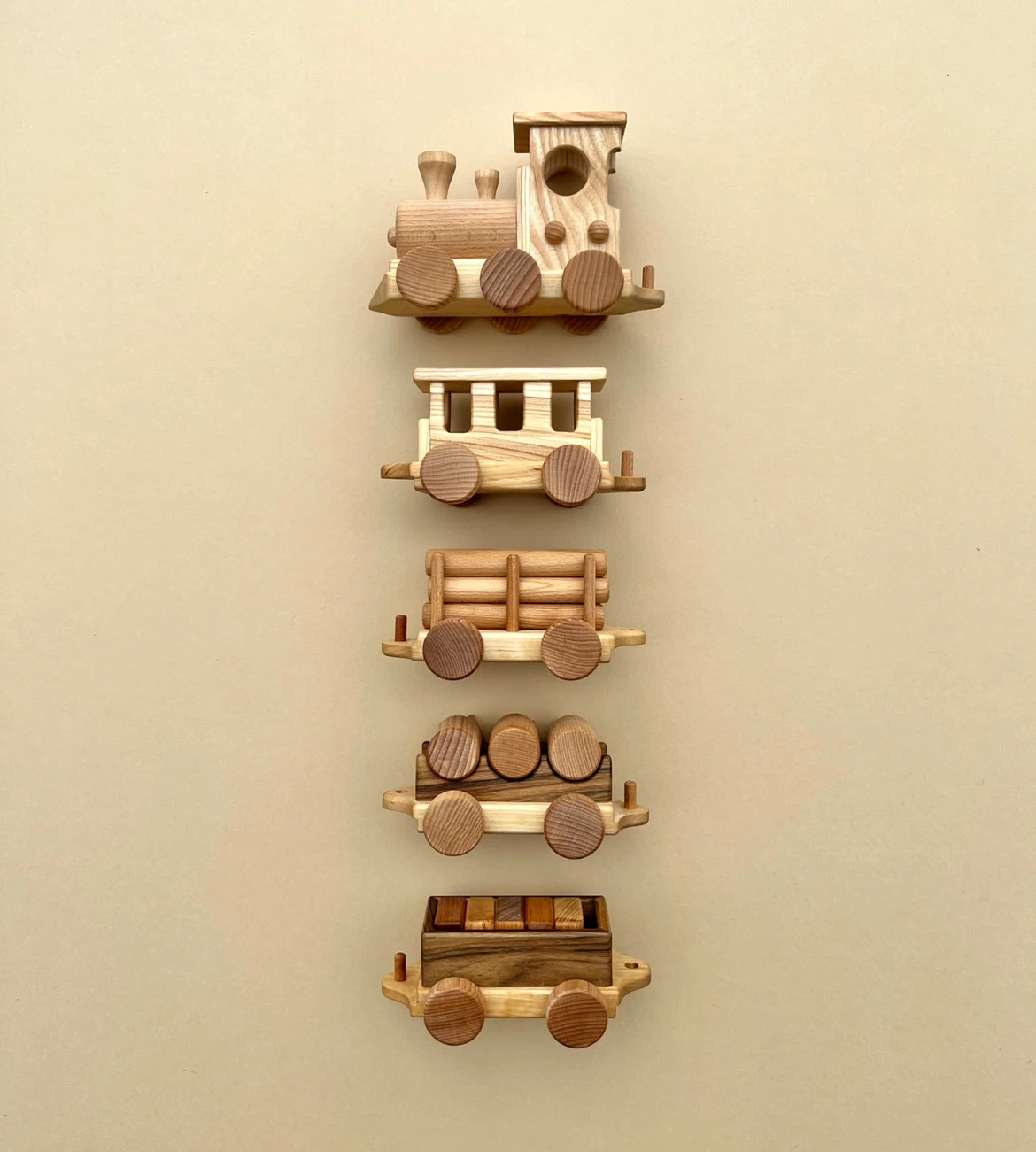 Handmade from beech wood, this set includes the locomotive, one passenger gar and three freight cars.