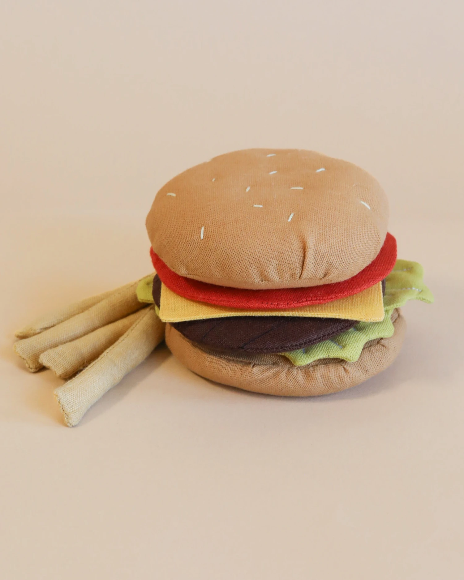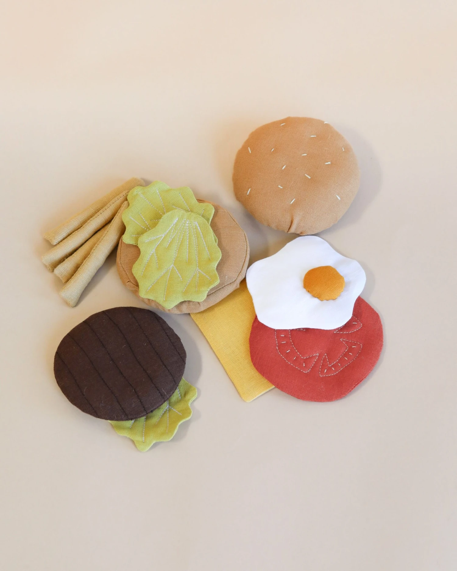 This handmade set includes: hamburger buns, 3 lettuce leaves, tomato, cheese, fried egg, burger and 4 fries.