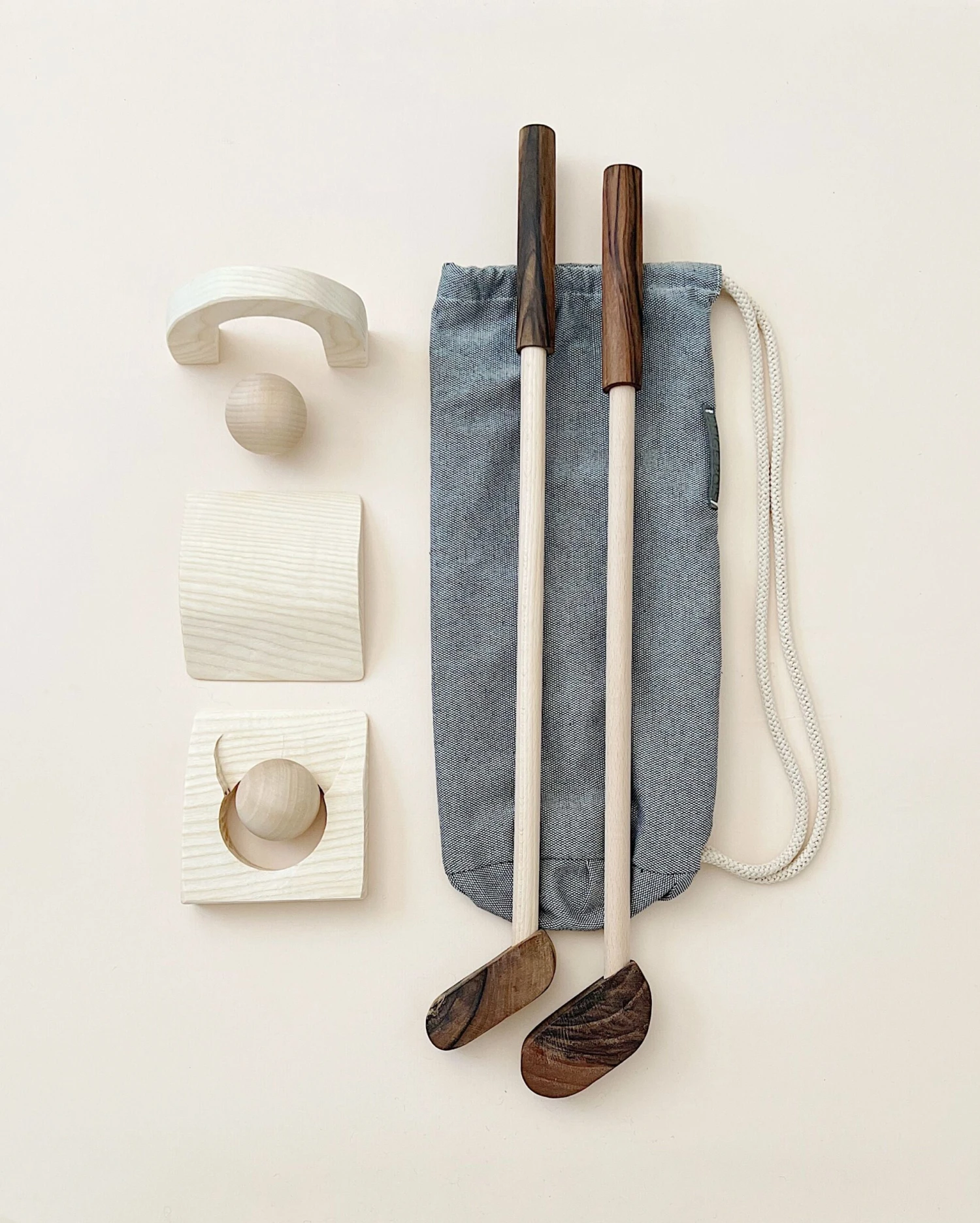 A fun wooden toy that includes 2 clubs, 2 balls, 1 hole plate, a slope and a gate. All crafted from wood for natural, long-lasting durability. Made from black walnut, ash wood and beech wood.