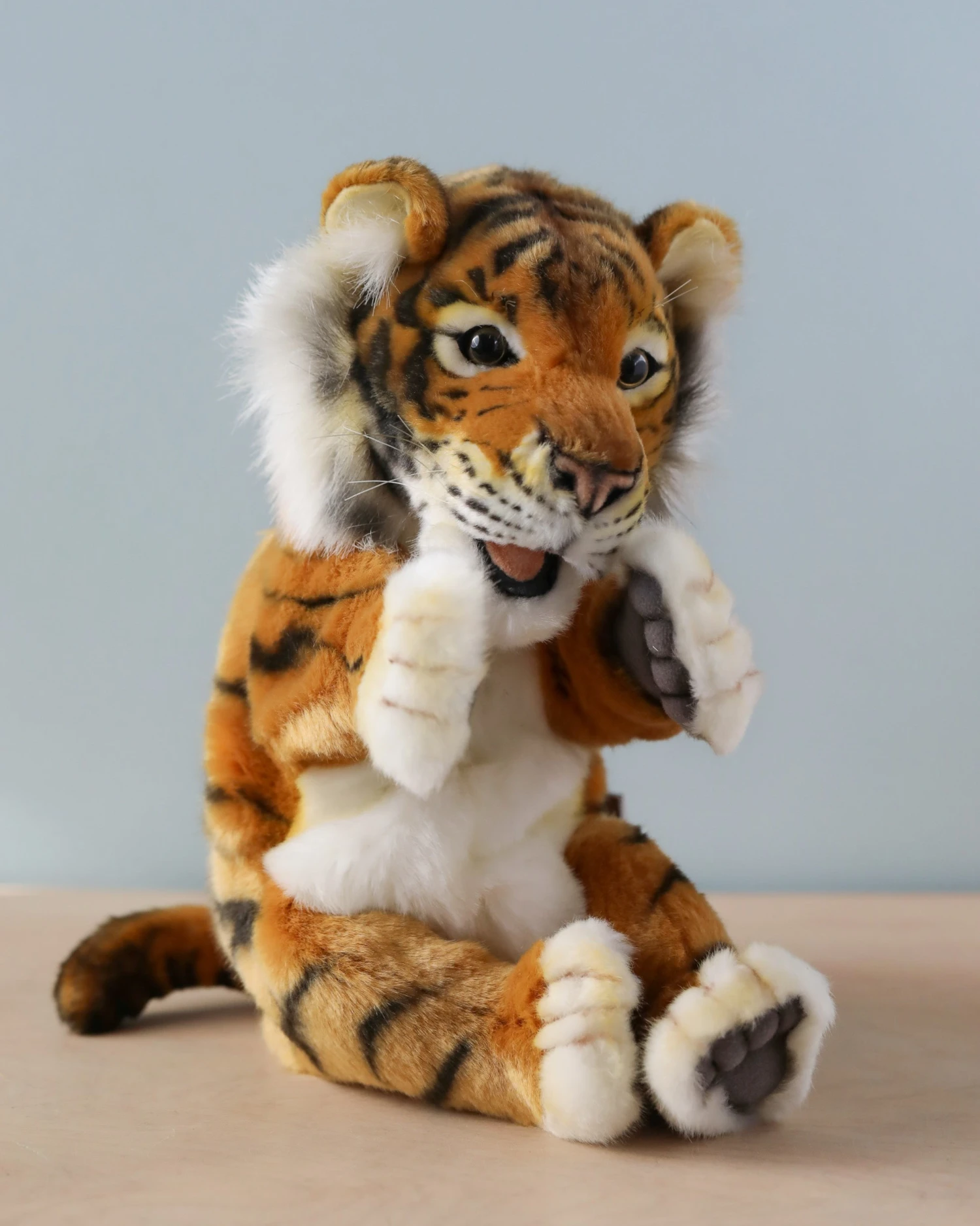 Artisans hand sew the animals “inside out”, an old world tradition that results in the mininization of seams, and their bodies are carefully “sculpted” to create “musculature” and “features” like movement in a walking or sitting position that are unique to each creature. On average, there are 42 separate pieces required to make each animal, that must be combined by a team of truly creative artists to create the distinctly realistic features that characterize HANSA animals. (Some animals have as many as 240 different parts!) Each animal is individually hand sewn, to give it a unique “personality”, there are more than 860 different fabrics and man-made furs from which the “coat” and “hides” are made, along with over 6000 sets of different eyes, whiskers, claws, noses, and related accessories allocated for creating these wonderful plush animals. Stuffing emphasizes careful attention to the placement of the highest quality man-made materials.