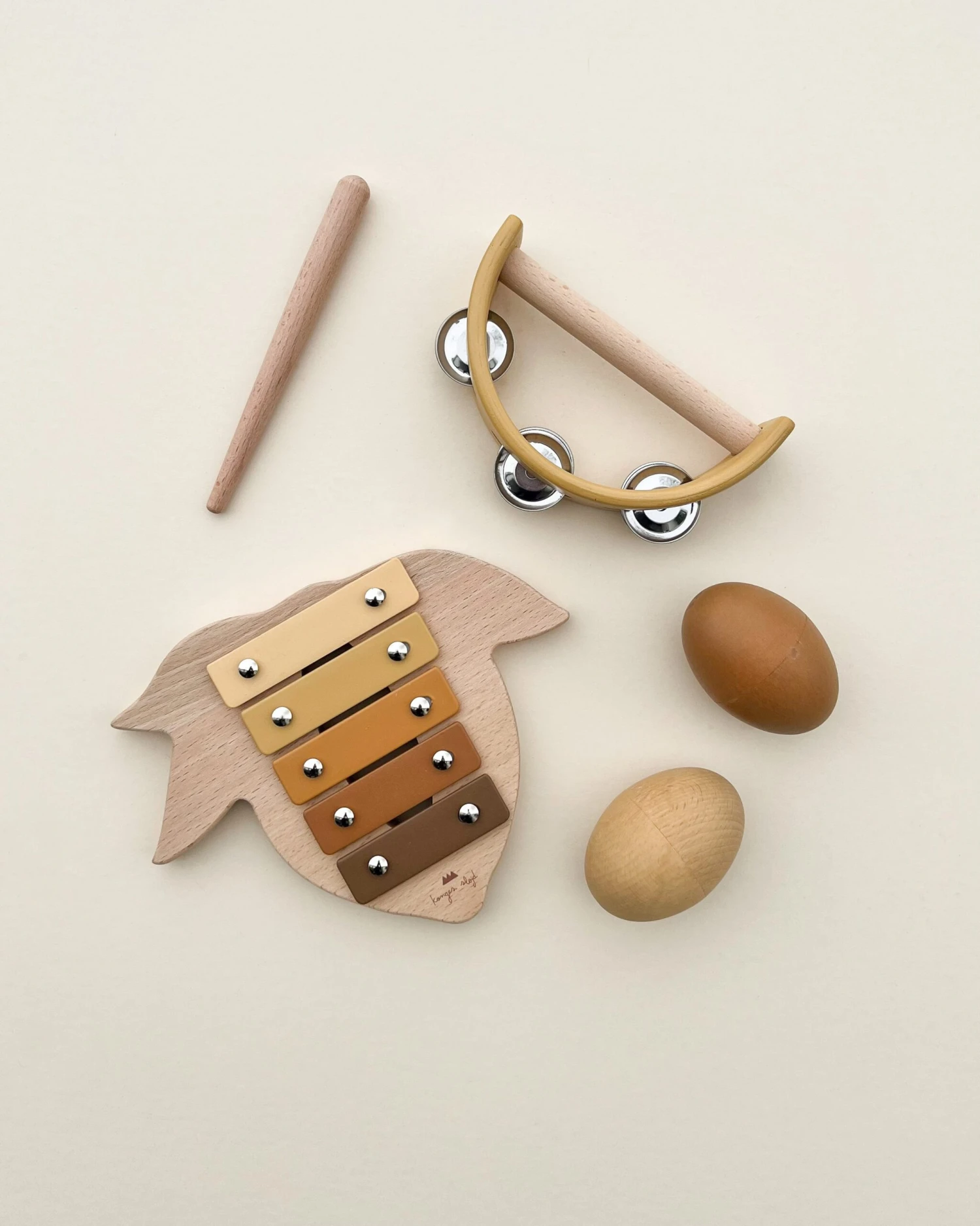 This set includes a handheld tambourine, rattle eggs and xylophone