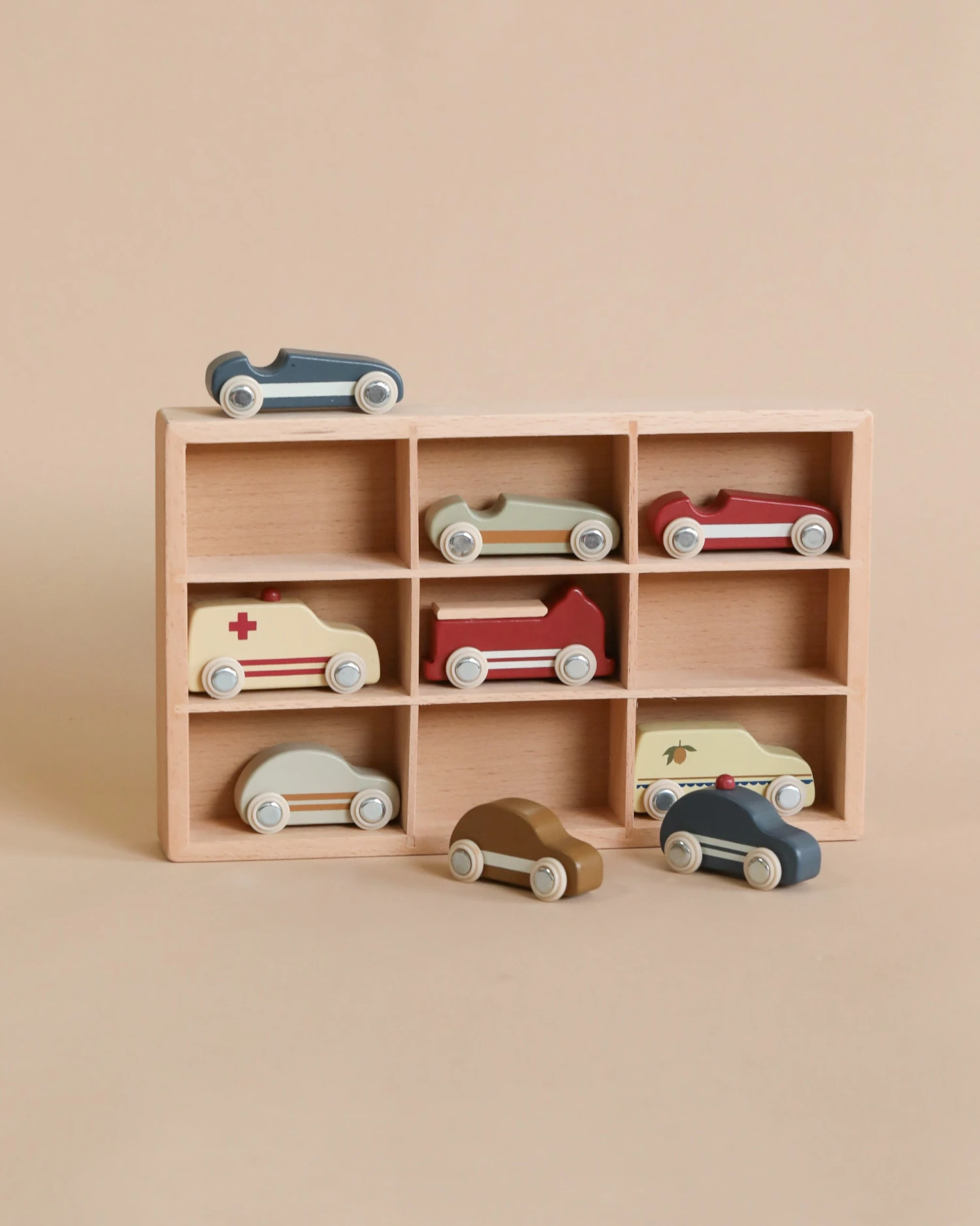 Wooden vehicles made with responsibly sourced beech wood and non-toxic paint. Designed with rotating wheels.