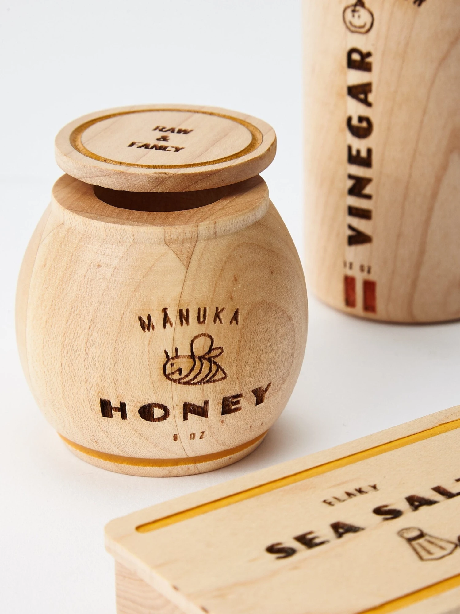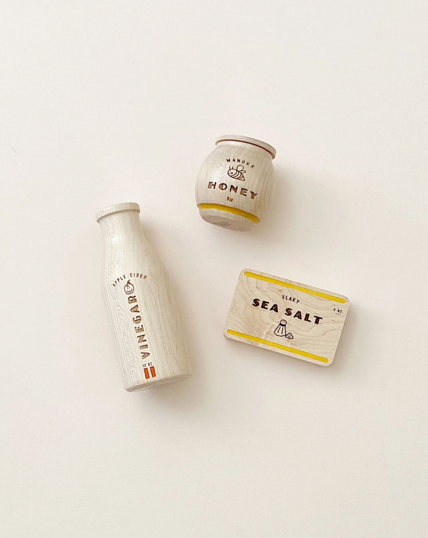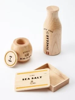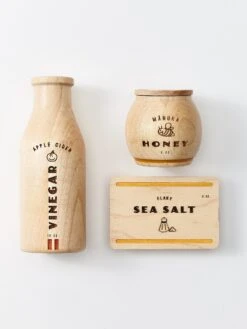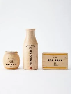 A modern take on the pantry essentials every little chef should have in their arsenal. Jar and box open for expanded play. Each set includes Apple Cider Vinegar, Manuka Honey, and Flaky Sea Salt and comes in a beautiful cotton drawstring bag.