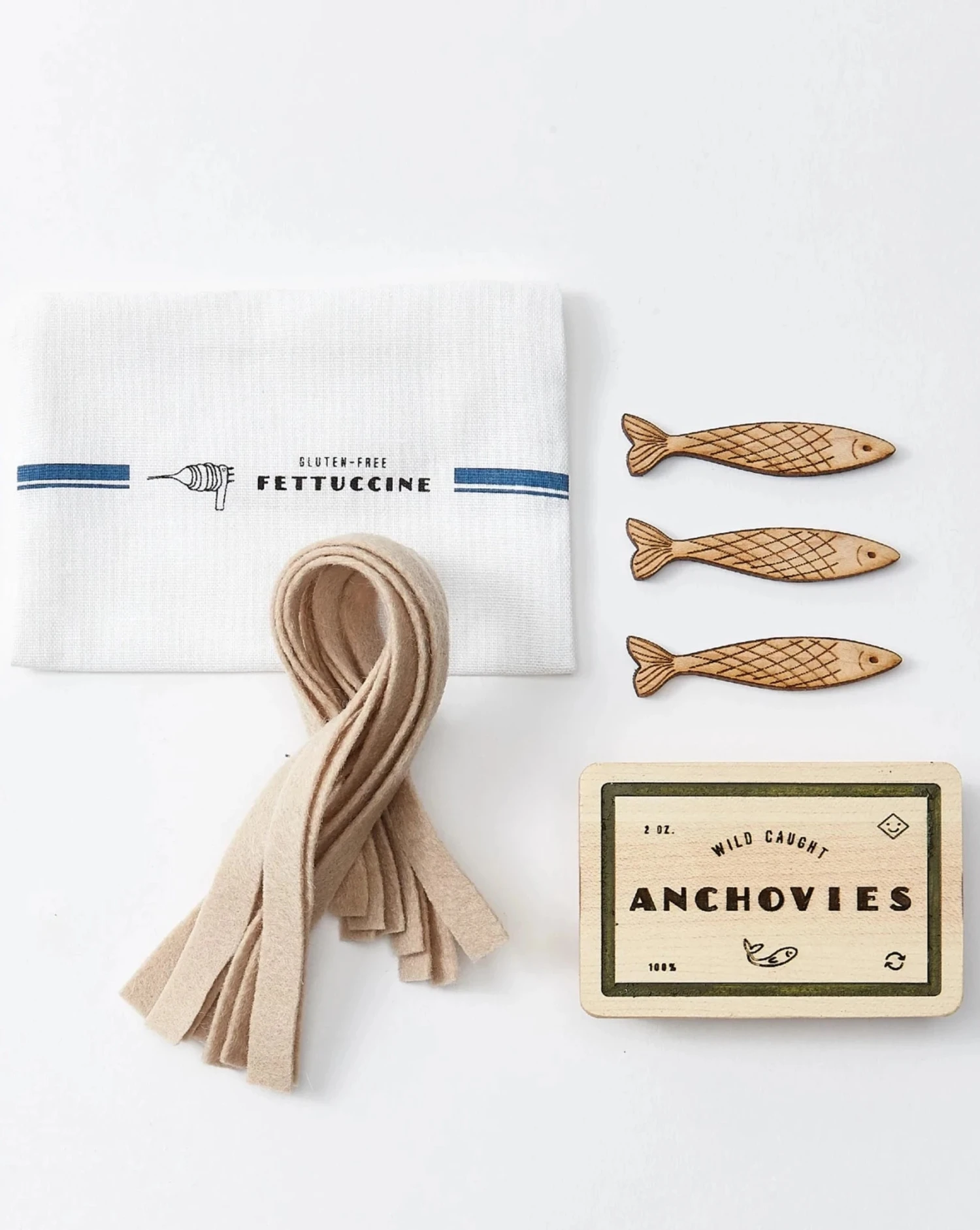 There’ll be nothing plain about pasta night when your little chef whips up the classiest dish ever with our Pasta Set. Featuring little wooden anchovies that store neatly in their own wooden box and gluten-free fettuccini in a bag of its own, this Pasta Set is a delight. Each set includes a wooden Anchovies Box, 3 Anchovies, felt Fettuccini, and a cotton storage bag. The set comes in a beautiful cotton drawstring bag.