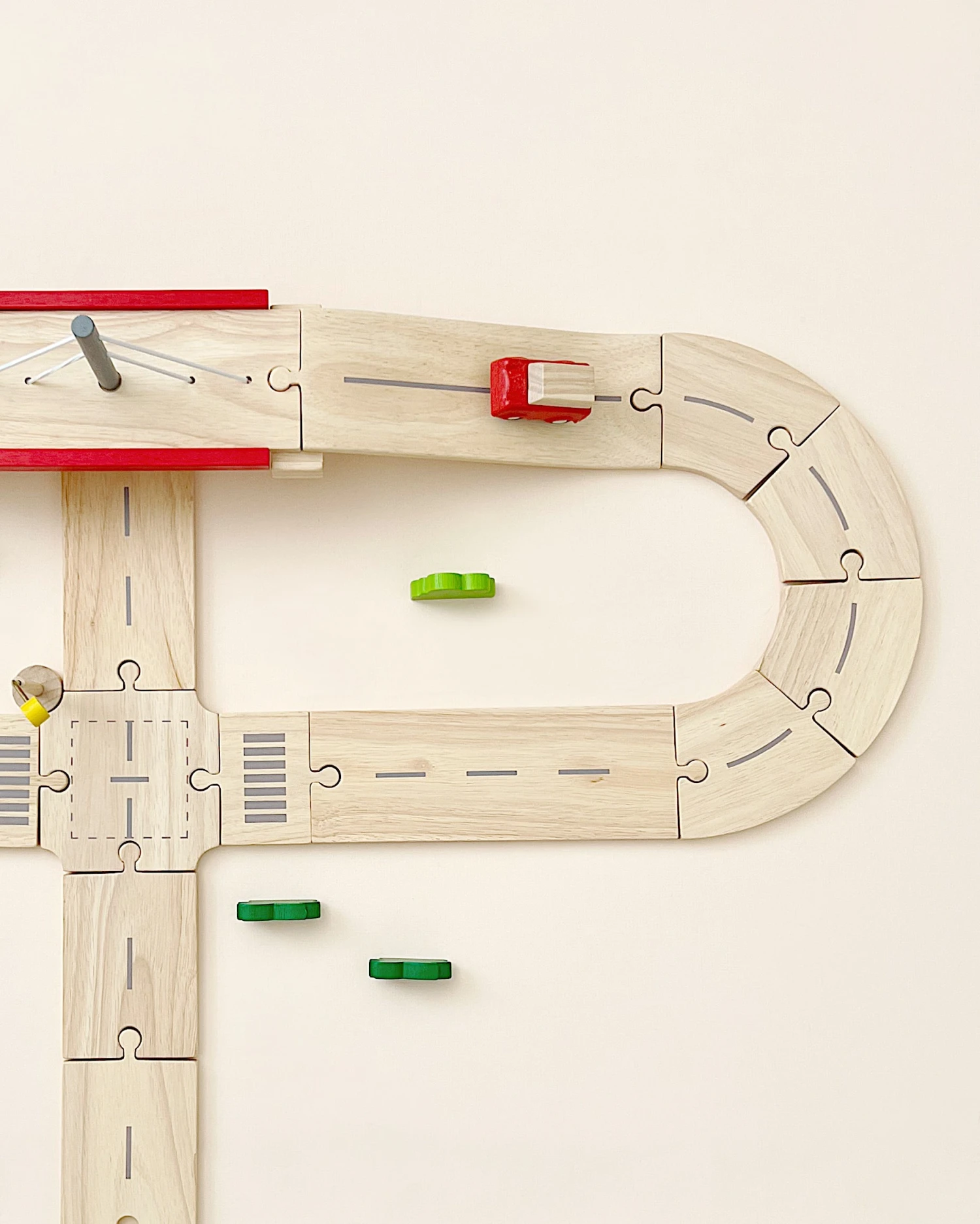 Enhance your pretend-play transportation system with the PlanToys Road System set! Complete with 27 tracks, 1 bridge, 1 car, 1 street light, and 4 bushes. There are 34 pieces in total with this set. Children have everything they need to bring their pretend city to life. The Road System is compatible with PlanToys cars and plays nicely with other sets. Sustainably made with reclaimed rubberwood in Thailand.