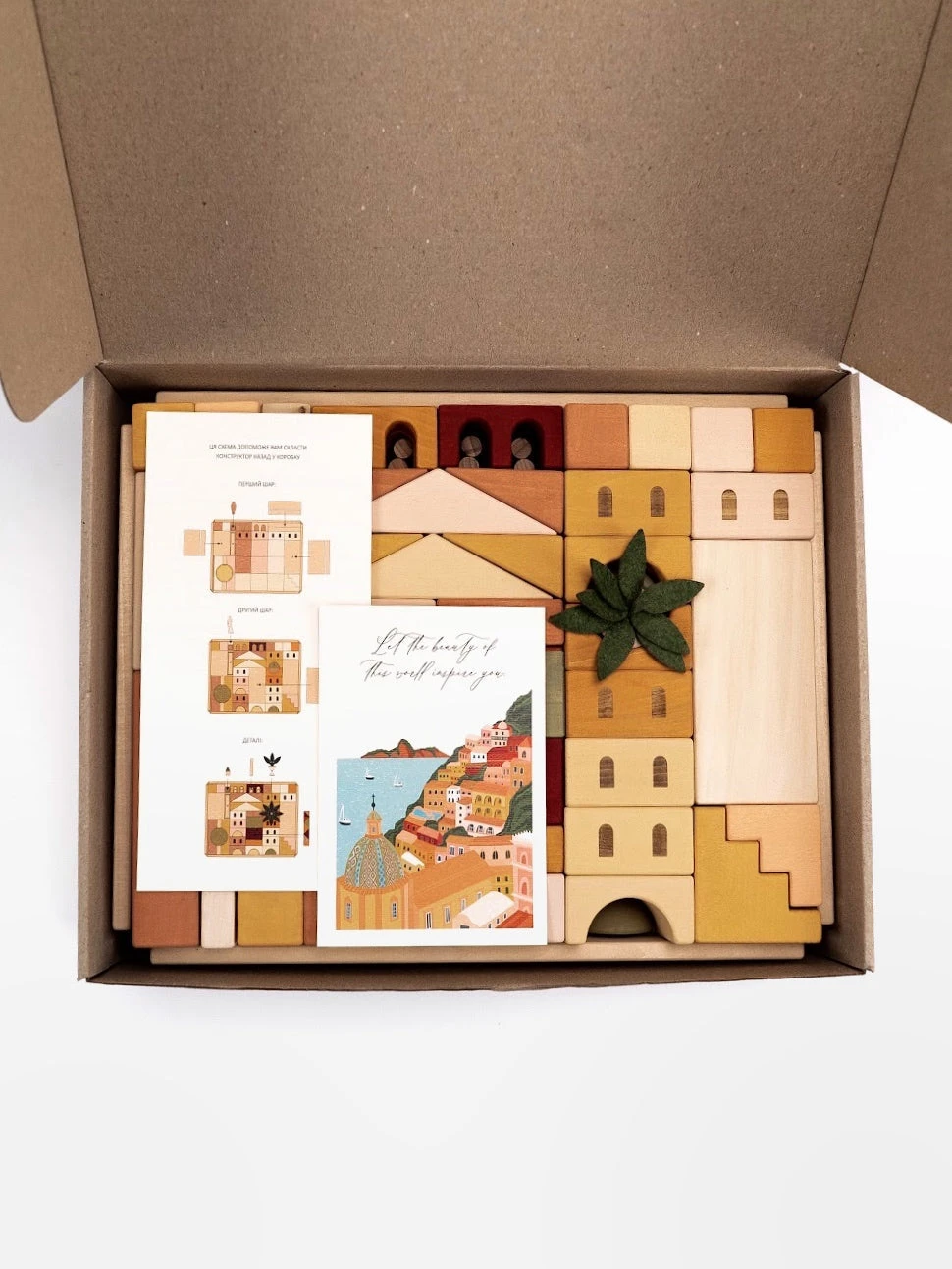 The set celebrates Italy – a sun-drenched country renowned for its beauty and art. Feel the atmosphere of picturesque streets and bright colors right in your home! The color palette is bright and cheerful, reminiscent of Italian seaside towns. You can let your imagination run wild with the multitude of pieces, from blocks and plates of different sizes to houses, stairs, arches, and columns.