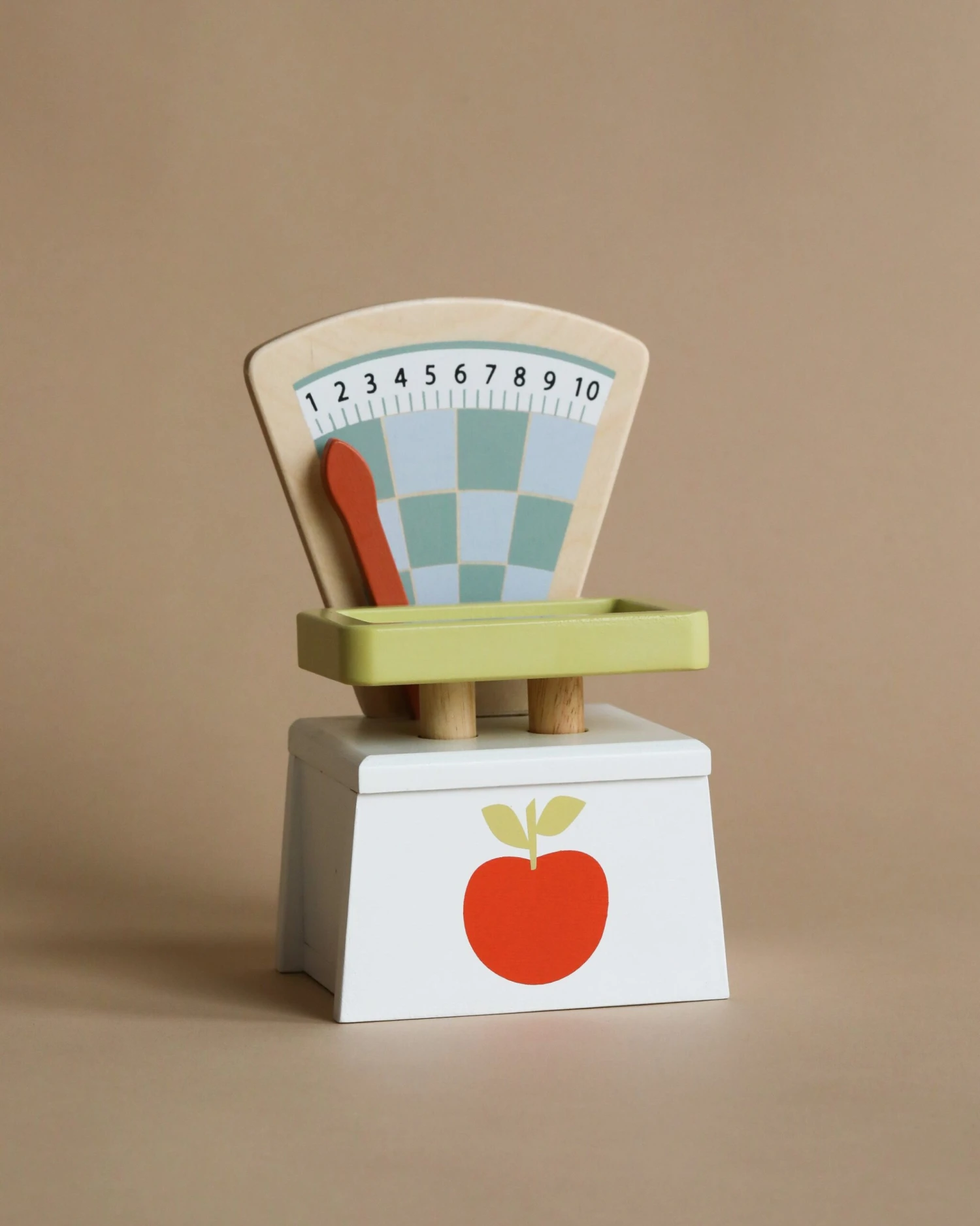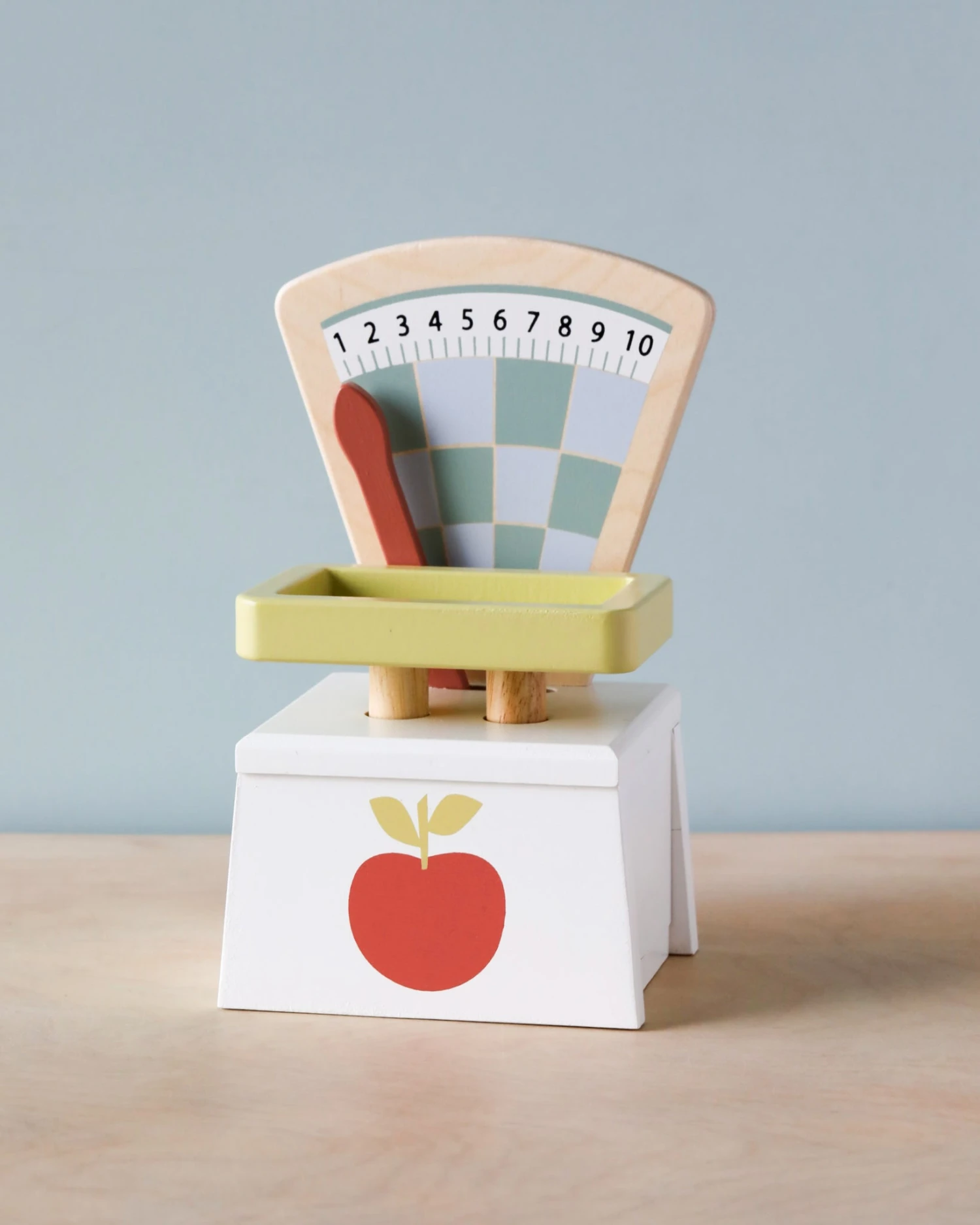 These retro-styled grocery weighing scales are the perfect accessory to pretend play shopping! Place the fruits and vegetables on the tray and see the wooden lever move.