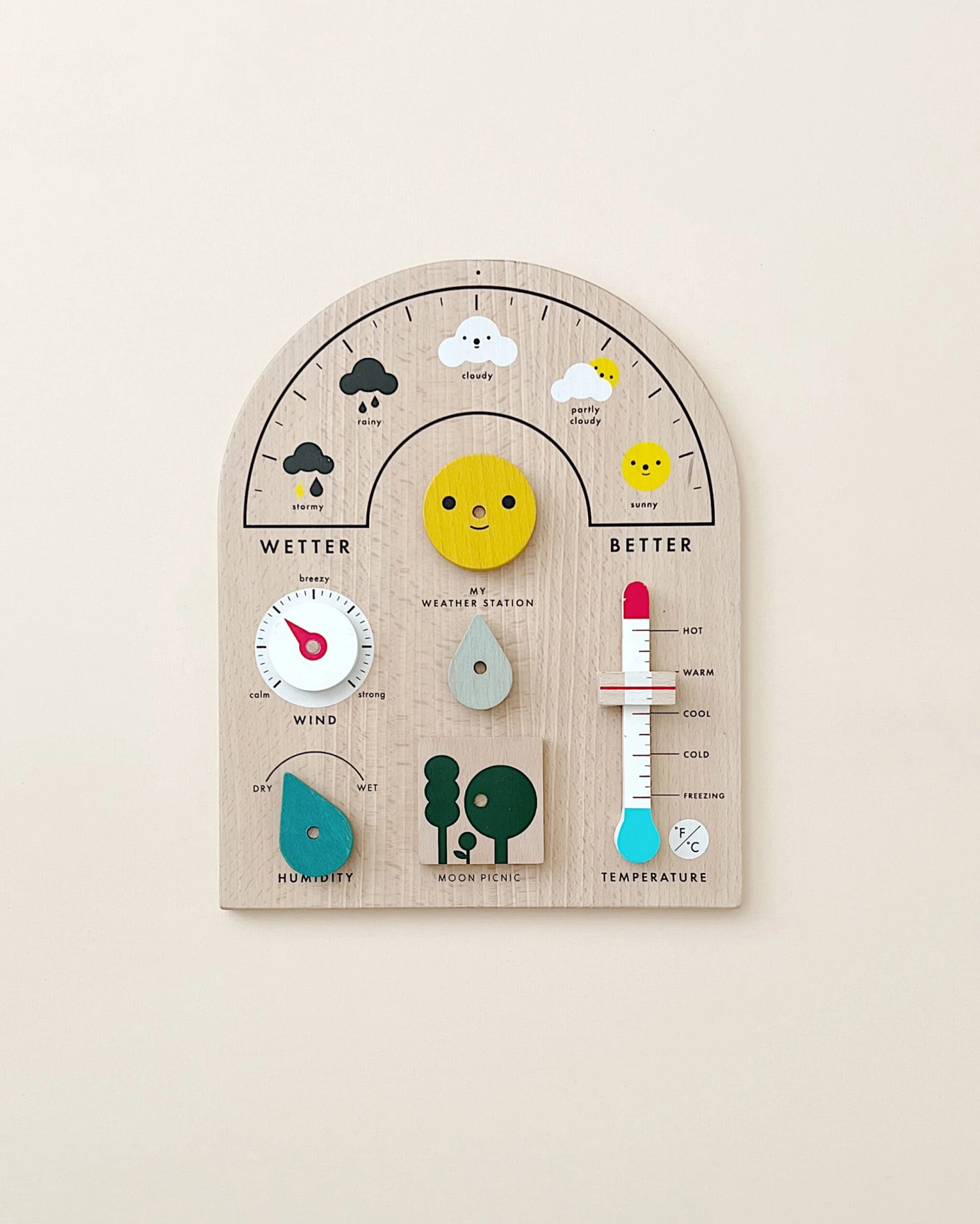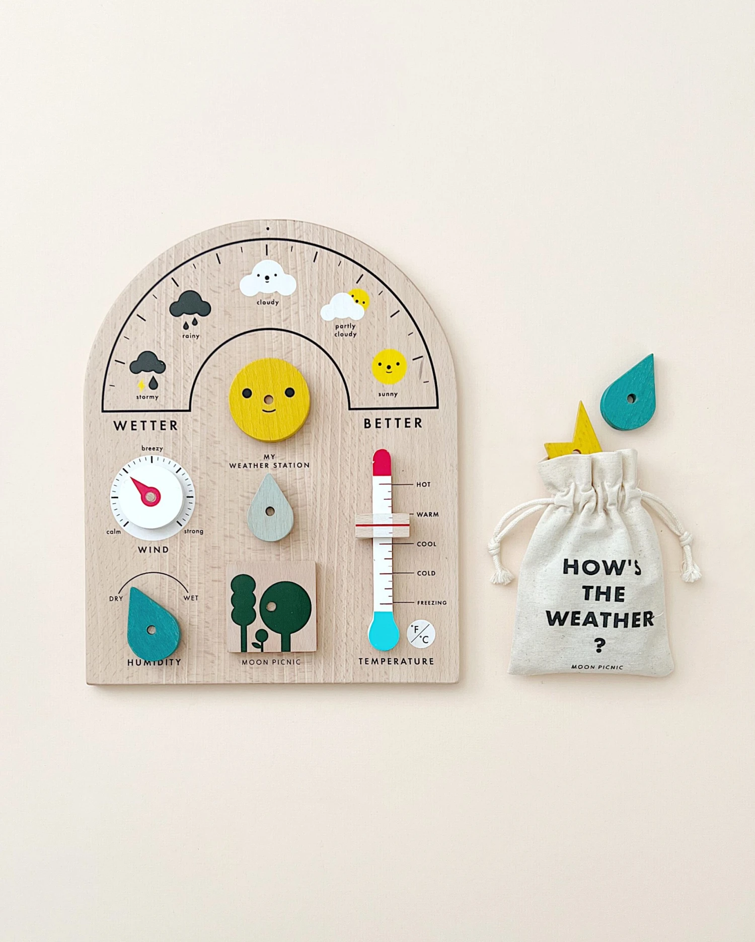 Includes: 1 base, 4 movable dials & slider, 5 weather pieces, cotton storage bag and introduction card.