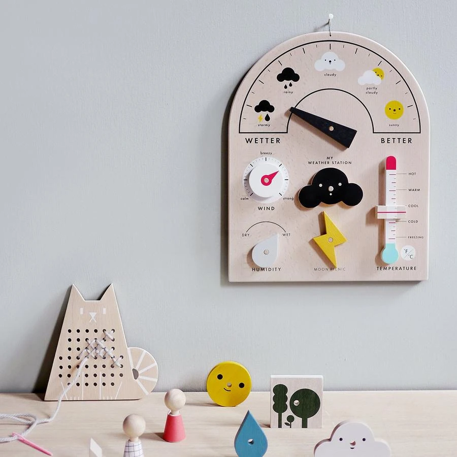 This fun & educational interactive toy has 4 movable parts and 5 weather symbols to display so little meteorologists can report and forecast the weather.