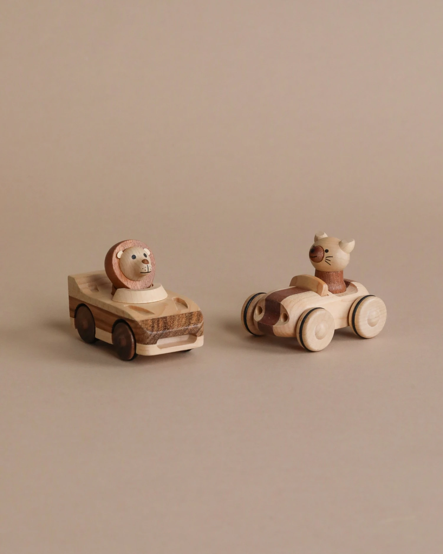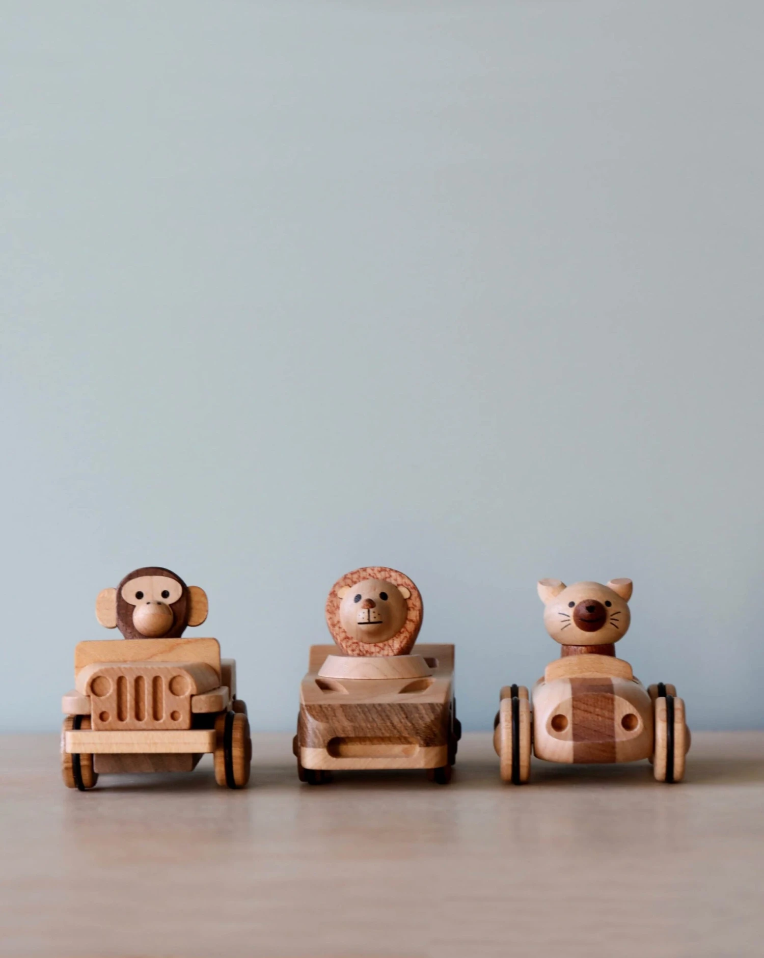 Made of solid wood with a pull back feature. The animal is not removable. Available in three different designs.